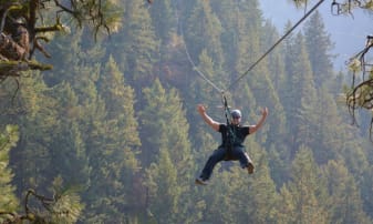 Experience seven lines, two sky bridges, and out-of-this-world views on this ultimate outdoor experience in Coeur d’Alene. Your adventure will start downtown where we will gear you up for your tour. You will then be shuttled to Beauty Bay, 12 miles east of downtown. A Yamaha Viking UTV will be waiting for you upon arrival at the property. An exciting mile long drive with an 800ft vertical foot climb are what lie between you and your first step off our platform and into the sky. You will soar from tree to tree for 2 - 2.5 hours before ending the course with a pretty epic surprise.